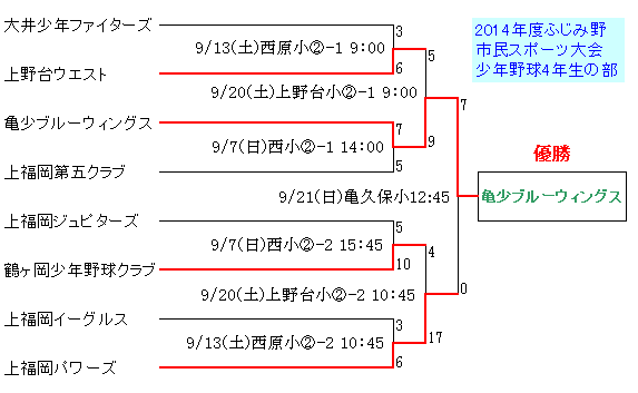 澤藤隆一は雫石町観光大使ですが、福田こうへいさんも2014年4月から雫石町観光大使に就任しました ちなみに、監督を伊原さんから田辺さんに代えた西武ライオンズのオーナー;西武ホールディングスの後藤高志社長も雫石町観光大使です ![]() 2015年2月1日(日) 富士見市びん沼自然公園特設コース ウエストは6年2人、5年4人、4年1人で1部出場、22位、皆頑張った ![]() コース中盤、力走する渡辺巧真主将 これが今期野球としては最後の大会、西原小で2014年11月15日上福岡第五クラブに1-2Xサヨナラ負け ![]() 春季大会に続き、 大井少年ファイターズが優勝! 10月19日(日)抽選会、11月3日(月)開会式(坂戸市民総合運動公園軟式野球場)と1回戦、11月9日(日):シードチームが登場して2回戦8試合、11月15日(土):3回戦と準々決勝のダブルでBEST4決定、11月22日(日):準決勝と決勝のダブルで行われます ウエストは夏季大会優勝の第1シード川越スラッガーズのブロックの相対シ−ドです 各地区のチャンピオンチームがずらりと並んだ恐怖のブロック、よくもこんな抽選引いたもの、しかし夏季大会も同じだったのにブロック優勝! 1回戦朝霞フレンズに10-3勝利、2回戦大東スポーツクラブ少年団に2-1会心の逆転勝利、3回戦勝瀬キッズに3-0完封勝利、A1ブロック決勝は優勝候補新町トレジャーズに5-4薄氷の勝利でした。しかし準々決勝芦山公園での坂戸ロイヤルズ戦0-8で完敗、メダルを逃しました ふじみ野市からは他に大井亀少クラブ、大井少年ファイターズ、大井ブルーウィングスが出場します 11月9日(日)2回戦芦山公園C-2 11:15 初雁フェローズを3-2撃破した三芳スカイヤーズと対戦、少しでも長く試合していましょう と書きましたが、1、2回にボコボコ打ち込まれて7点取られ、10四死球と3安打8残塁で、初雁フェローズと同じパターンで三芳スカイヤーズに敗退 対戦結果は東入間学童野球連盟ホームページの『他大会の模様』をご覧下さい 川越スラッガーズが夏に続いて優勝! 大井亀少クラブは第3位 大井ウエストは6年生の部Cブロック(8チーム)に登録、強豪揃いのブロックです。A〜Dブロック、合計33チームで争われます 浦和西バッファローズ、清瀬七小松山野球クラブ、片山ウィングス、宗岡ヤンガース、東野小レッズ、新倉フェニックス、朝霞フレンズ 5月18日(日)片山ウィングスと片山小学校で第1戦、3-7敗戦 0勝1敗・・・長々と解説しました 7月13日(日)西原小学校で10時頃から清瀬七小松山野球クラブと第2戦、6-6タイブレーク0-1敗戦 0勝2敗 7月20日(日) 西原小学校で10時頃から新倉フェニックスと第3戦、楽勝ムードから一転6-6タイブレーク、2回やってなんとか4-1勝利 1勝2敗 10月18日(土)午後宗岡三小で宗岡ヤンガースと第4戦、またしても3-3タイブレークサヨナラ負け、1勝3敗で予選敗退決定(>_<) 清瀬七小松山野球クラブが6勝1敗でブロック優勝、新倉フェニックスが5勝2敗で2位決定、この2チームが決勝トーナメントへ 残るは消化試合、10月18日(土)10時西原小で第5戦、昨週敗れた宗岡ヤンガースに翌日1-0で勝った朝霞フレンズに9-2コールド勝ち 11月2日(日)西原小で第6戦、浦和西バッファローズとまたしてもタイブレーク、4回目だよ、表に8点取って大勝、通算3勝3敗 11月8日(土)西原小で最終第7戦、東野小レッズに3-4敗戦、合計3勝4敗で終了 決勝トーナメントの模様は若松ブルーウィングスのページをご覧下さい。決勝戦は12月6日(土)