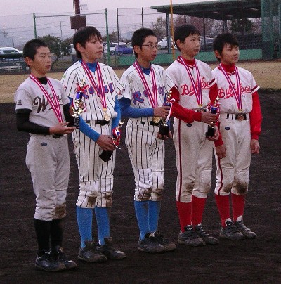 1回表大井ウエストは先頭打者倭選手がレフト前にヒット、2盗、3盗して2番打者のセカンドゴロの間にホームインして1点先制、3回表また先頭打者倭選手がレフト前にヒット、1塁牽制悪送球で2塁へ、3盗謀りキャッチャーの3塁悪送球を誘って2点目のホームイン、4回表にはヒット、四球の走者を9番水上選手がバントで送り、1番倭選手がまたしても左中間2塁打で2点追加、投げてはエース松原投手が4回1安打8奪三振のピッチングで無失点、決勝戦に備え5回から田口主将がマウンドへ、2死を取りましたが3番大野選手がセンターオーバーの3塁打、ワイルドピッチで1点与えたものの、その後を抑えてセーブポイントをあげる快勝でした。狭山バッファローズは1回戦富士見エンゼルスに大野選手の3本塁打などで11-2のコールド勝ち、みずほ台ヤンガースを2-0完封、霞ヶ関イーグルスを12-1、白小クラブを14-0と強力打線とキャプテン4番エース藤井の快投で勝ち上がりましたが、大井ウエストの松原、田口のダブルエースの前に1点に抑えられ、大井ウエストの1番倭選手の猛打賞、2犠打6盗塁に対し諸井捕手が2刺殺と奮闘したものの及びませんでした。強力打線でも好投手は打てない、逆に好投手を攻略するには好球必打と機動力で崩すという野球の醍醐味が典型的に現れた試合でした。