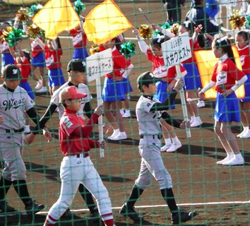元気良く手を振る赤い霞ファイヤーズと比べるとグレーのウエストは弔いの葬列みたいで・・・ |