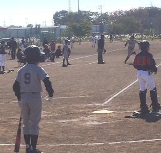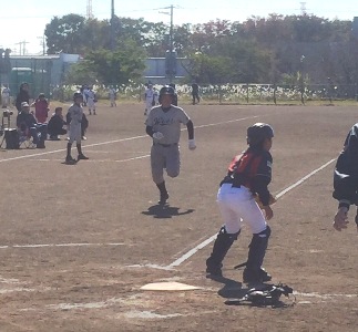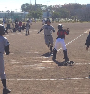 5回裏康平がセカンド、センター、ライトの真ん中にポテンと落としてヒット出塁、2盗狙います。「もっとリード、もっと、モット、あと2m」チョット言い過ぎか?しかし斗空が刺されているキャッチャーです。蓮は2盗、3盗してます、2盗はともかく、この強肩捕手から3盗するのは余程タイミングを計って盗むのが得意なランナーでないとできません。4年生ながら末恐ろしい...康平スタート、岡田捕手、合点承知の介、2塁送球タッチアウト〜〜〜!リードが小さ過ぎました。それとスタートのタイミング、盗塁を助ける空振りなどいろいろ複合して成功するのですが、一般に足がそれなりにある走者なら2盗はほぼ成功します。強肩捕手でも5回に1回刺せればスゴイのです。斗空と康平が刺されるとは・・・。柊哉は2盗していますが、これは聖との1、3塁の時なので捕手は2塁へ投げませんでした。厳密に言うとこれは盗塁とは記録されません。ウエストでは選手の健全育成のために優しく前向きに盗塁をつけていますが、公式には守備側が殺そうとする意思がない場合は盗塁とはしないのです。そうしないと捕手が堪らないからです。もっとも柊哉はリードが良くて足も速いので、柊哉の2盗を阻止できる捕手はほとんど居ないでしょう。だから柊哉が出たらチャンスなのですが、出ないからね...(>_<) 祐茉はサード内野安打、こんなものです。そして2盗成功。祐茉が盗塁とはこうやってするもんだ、と大きなリードからお手本を示しました。低学年もスタンドから応援していましたから、参考になったでしょう。斗空は引っ張ってファーストゴロ、進塁打となって2死3塁で寛太、1-1からワイルドピッチ、祐茉突っ込んだけれど、後ろのネット下コンクリート壁に当たって跳ね返ってきました。岡田捕手捕って、これを見て祐茉急ブレーキ、さよ〜なら〜と3塁へ帰ろうとしますが3塁送球、この後三−本間のランダウンプレーの末タッチアウト、これはしょうがない、この壁はこれがあるので要注意。6回裏は寛太から始まり、センター前にライナーで運び、2盗、3盗、ジョー四球、聖、柚、柊哉と3連打、3点加え、なおも蓮が送り、康平ライトフライ、祐茉セカンドライナー、しかしもう時間は過ぎていてゲームセット