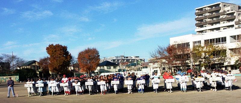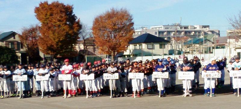 | 左端ふじみ野市少年野球連盟草田審判部長、その右:前回優勝の鶴ヶ岡少年野球クラブ、以下1回戦の対戦チーム順で整列;上福岡イーグルス−大井亀少クラブ、毛呂山イーグルス−大井少年ファイターズ、大井ウエスト−ニュー長瀬ドラゴンズ、大井ブルーウィングス−松山リトルファイターズ、上福岡JFG−上福岡パワーズ、富士見エンゼルス−上福岡第五クラブ、高階南ヤンガース(−鶴ヶ岡少年野球クラブ)、みずほ台ヤンガース−三芳ドリームズの計16チーム