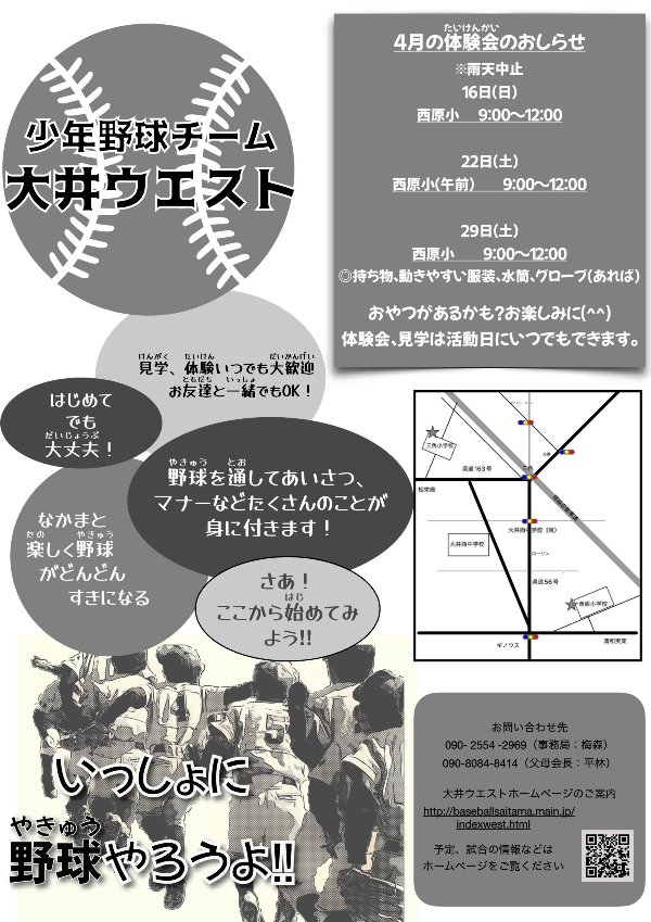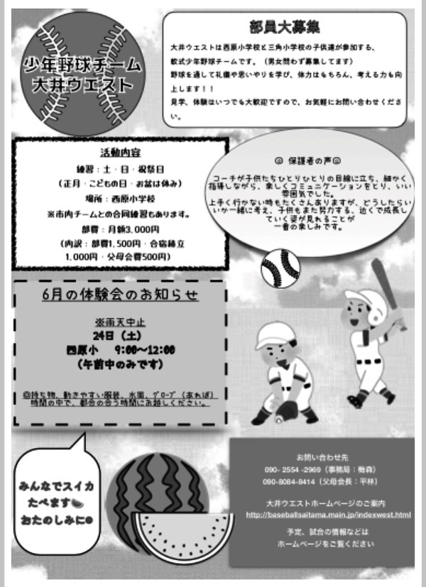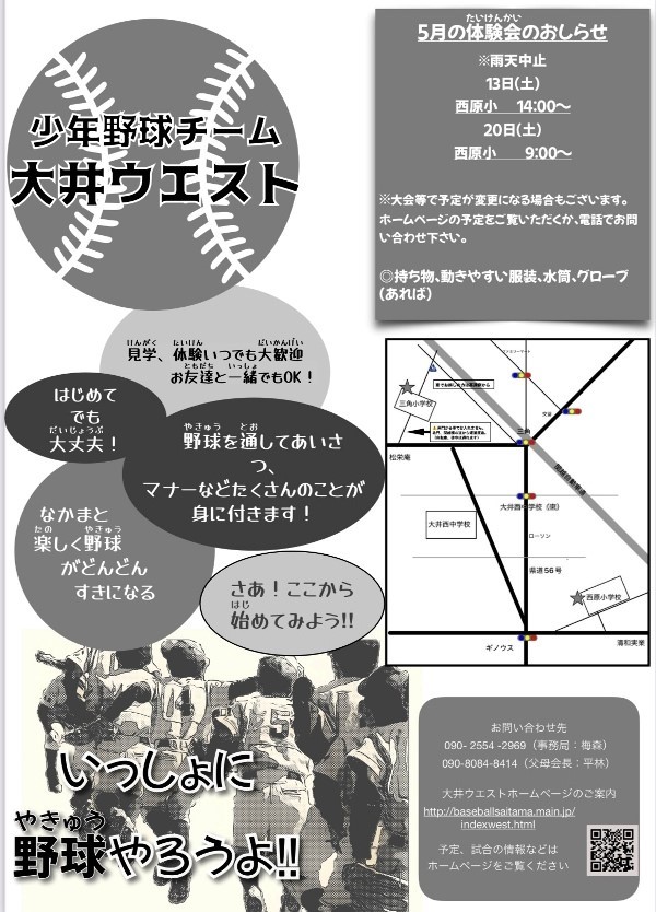 少年野球は「教育」です 少年野球はどんなスポーツよりも頭を使い、緊張と弛緩を学ぶものです。これを極めると座禅と同様、自律神経コントロールができるようになります。また何よりも、仲間との絆が大切とされます。世代を超えての交流によって、人とヒトとの繋がりが深まり、たくましさ、思いやりと優しさが醸成されます。挨拶ができる元気な子になります。この経験がもたらすものは、将来社会人になった時に、ウエストで野球をやって良かったときっと思えるはずです。さあ、グラウンドに子どもたちを送り出しましょう。お父さんもお母さんも、子どもが小学生の時が一番充実して力がみなぎる時です。それはまだ子どもが親の庇護を必要とする時期だからです。そしてどんどん子どもが成長する時期だからです。中学生になるともう巣立ちが始まります。この大切な時期に、親だけで子どもを面倒見るのは大変です。でも親である限りやるしかありません。だからこの時期の親が一番たくましいのです。しかし、親以外の人が子どもを叱咤激励して育ててくれたら、こんな有難いことはありませんよね?そんな環境が大井ウエストにはあります。一度グラウンドに来て、見てみて下さい・・・ |