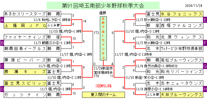 ● 第91回埼玉南部秋季大会は10月13日開会式、大井ブルーウィングスが21年ぶり優勝、栗原ビーバーズ準優勝、ウィナーズ少年野球倶楽部と上福岡JFGが第三位