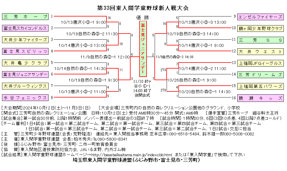 | 運営主管 | 三芳町少年野球連盟(会長:荒野隆浩) 東入間担当事務局 :芝本 広幸 TEL:090-6518-5484、鈴木雄一郎 TEL:080-5008-0082 |