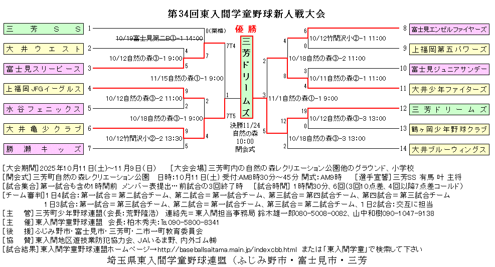 | 運営主管 | 三芳町少年野球連盟(会長:荒野隆浩) 東入間担当事務局 :鈴木雄一郎 080-5008-0082、山中和樹 090-1047-9138 |