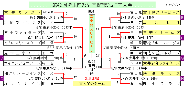 本大会(6年)一回戦は5/24(土)11時半から日高市・横手台グラウンドでA-2三芳ドリームズと対戦し、8-1で4回コールド負け。6/21(土)富士見市第二運動公園9時A-1Aブロック(富士見市)決勝:上福岡JFGイーグルス1-4川越スラッガーズ、6/22(日)亀久保小でCブロック(ふじみ野市)準決勝2試合;13時A-1和光リバーツインズVS大井ブルーウィングス、15時A-2大井亀少クラブVS大東スポーツクラブ
