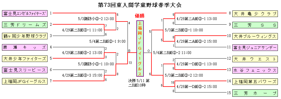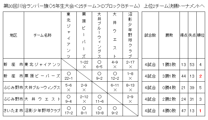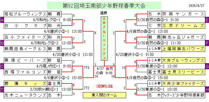 16-2 志木ニュータウンズ、鶴ヶ岡少年野球クラブ 21-1 朝霞ストロングス、大井ブルーウィングス