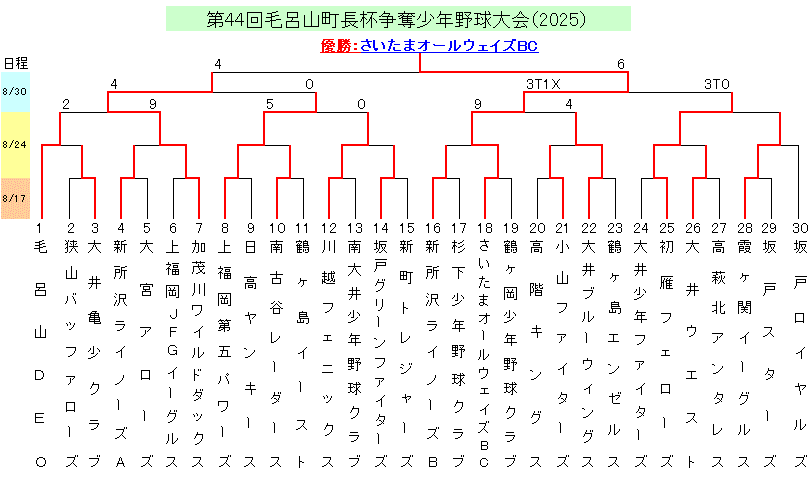 結果…高学年の部 優勝…毛呂山DEO、準優勝…大井ブルーウィングス、第三位…富士見スリーピース、川越スラッガーズ、ジュニアの部 優勝…富士見エンゼルファイヤーズ、準優勝…鶴ヶ島イースト、第三位…北原ウィングス、桶川ヤングアローズ