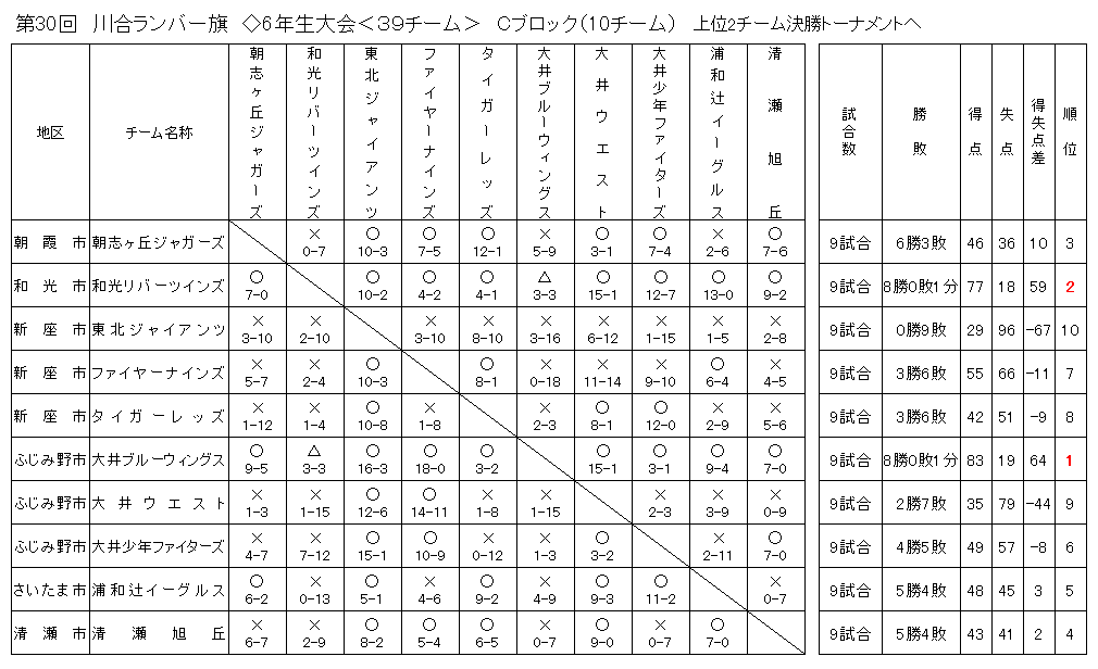 予選リーグ終了期限の10月19日までにCブロック10チームの中で全試合消化したのはウエスト含め3チームでした。10月18、19日の雨の影響で消化できなかったチームがあったため期限が26日に延長されましたが、Cブロックは勝ち点25で並んだ上位2チームが決勝トーナメントに進みます。得失点差で大井ブルーウィングスが和光リバーツインズを上回り1位通過となりました。朝志ヶ丘ジャガーズが未消化が多いため不戦敗(不戦勝の相手が勝ち点3でスコア9-0)ないし未消化(両チーム勝ち点-1でスコア0-0)扱いになると思われます