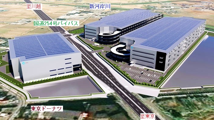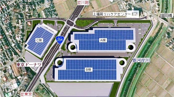 ふじみ野市運動公園周り 新河岸川を挟んでふじみ野市第二運動公園(旧福岡高校跡地)があります。南側に福岡江川(下水川)が流れ、その南にふじみ野市三芳町環境センターがあります。 この清掃工場から出る余熱を利用してタービンを回して発電し、バーデプールやお風呂を備えたエコパがあります。ふじみ野市運動公園の北西側には大規模物流施設CREロジスクウェアのB棟があります。この近辺は水害が発生するので大きな水貯留施設、いわゆる調整池が備えられています。更に北にCREロジスティクスA棟があり、その北に福岡橋があります
