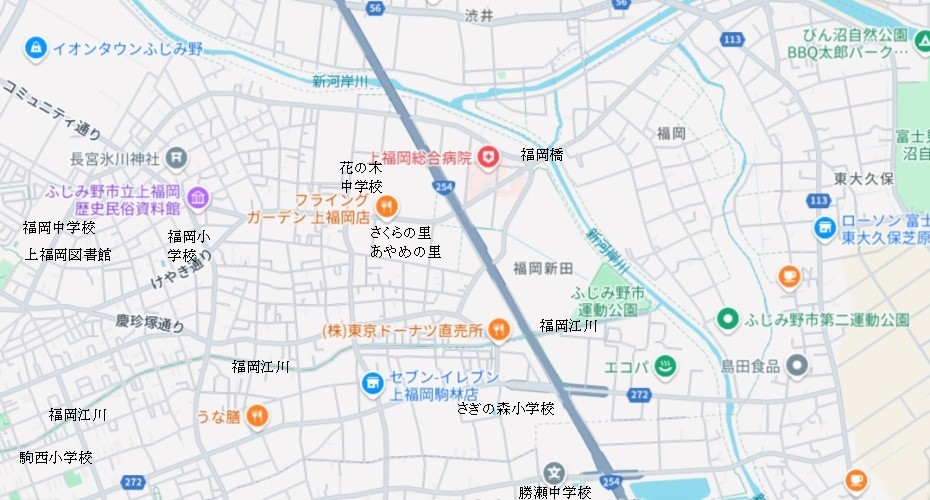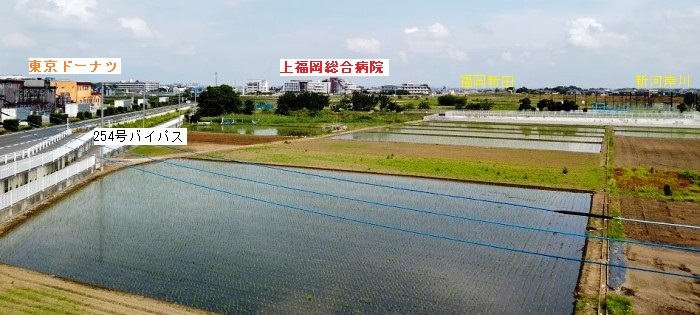 上福岡駅から自転車で中央通りを走って行きますと、慶珍塚で道が分かれます。右手慶珍塚通りを下り、築地から福岡新田集会所、仲の水天宮、薬王寺を過ぎて水宮を大きく右カーブして福岡江川に到達すると東京ドーナツ直売所があります。ここを左折して福岡江川沿いに走り、国道254号バイパスのアンダーパスを潜るとふじみ野市運動公園のテニスコートとフットサルコート、その奥に野球場があります