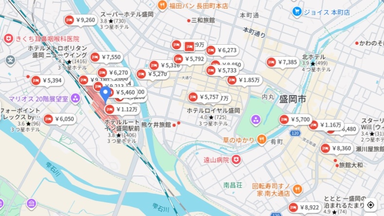 東京都山手線内のホテル宿泊価格が高騰して大問題になっています。名のあるホテルで素泊り1万円以下はほぼ無し、2万円覚悟などと言われ、東京出張者は電車代かけても埼玉、千葉、神奈川のホテルに泊まるなどと言う有様だそうです。しかし盛岡駅近辺はそんなに上がっていません。結局需要と供給でしょう。東京都区部はインバウンド需要が多いうえに、土地価格高騰、マンション価格高騰、人件費高騰、更に人手不足で、もうこれ以上ホテルは増えないのでは?と言われています。盛岡駅近辺(徒歩5分圏内)には、アパホテル、東横INN、ダイワロイネット、ルートイン、アートホテル、スーパーホテルなどアクセス抜群のビジネス・シティホテルが多数あります。特に東口(バスターミナル側)に集中しており、観光・ビジネスの拠点に最適です。